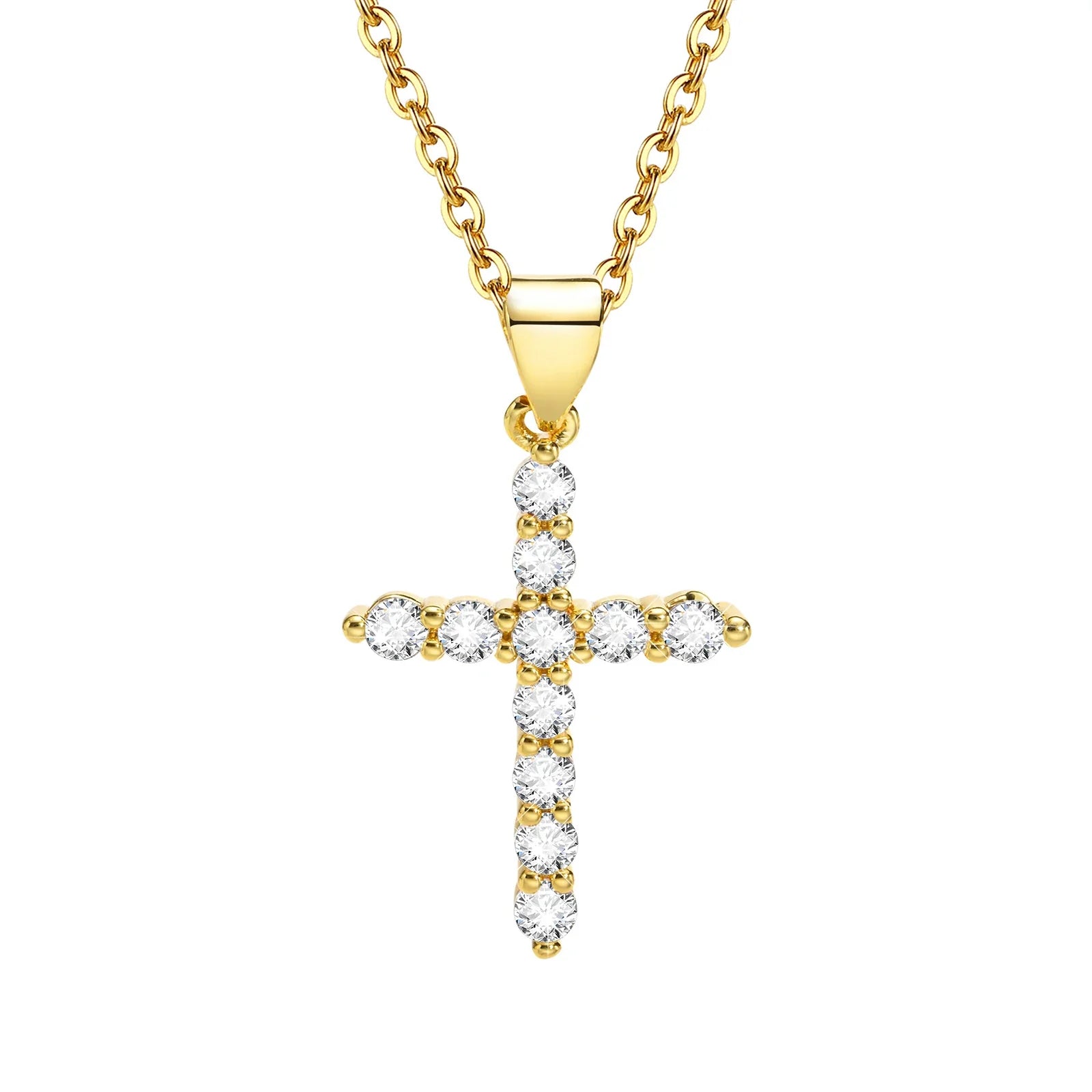 Suspended from a delicate gold-toned chain, the pavé-set cross shines with restrained brilliance, blending symmetry and clarity in a quietly reverent design.