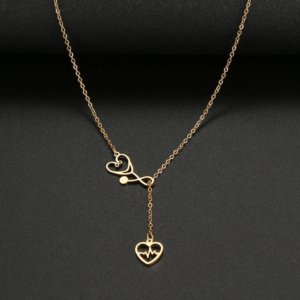 A symbol of care that never skips a beat. This gold-plated necklace features a delicate stethoscope design that flows into a heartbeat-lined heart pendant—celebrating those who lead with compassion and steady hands.