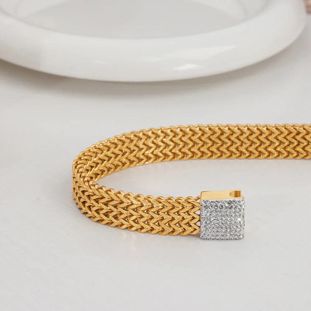 Interlocking links in polished gold and pavé texture build a striking contrast of structure and light. Anchored in stainless steel strength, each link flows into the next with a rhythm that feels both grounded and unmistakable.