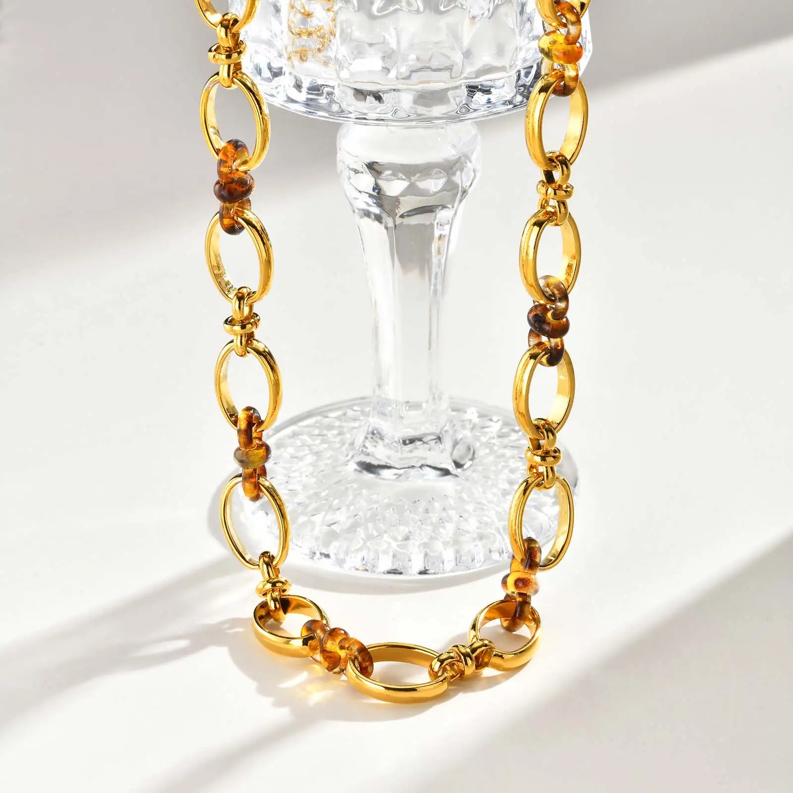 Gold-plated links meet resin ovals in warm, sculptural contrast. Each honey-toned piece catches and scatters light like flame suspended in metal.